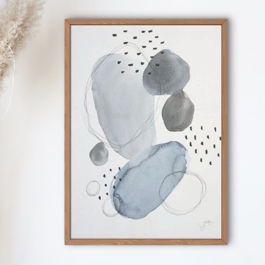 Original akvarel 30×40 cm i støvede blå nuancer med tynde sorte cirkler og stjerne-lignende prikker. Den blå planet er et roligt og drømmende kunstværk med galakseinspiration, der skaber dybde, balance og eftertanke i både hjem og kontor.