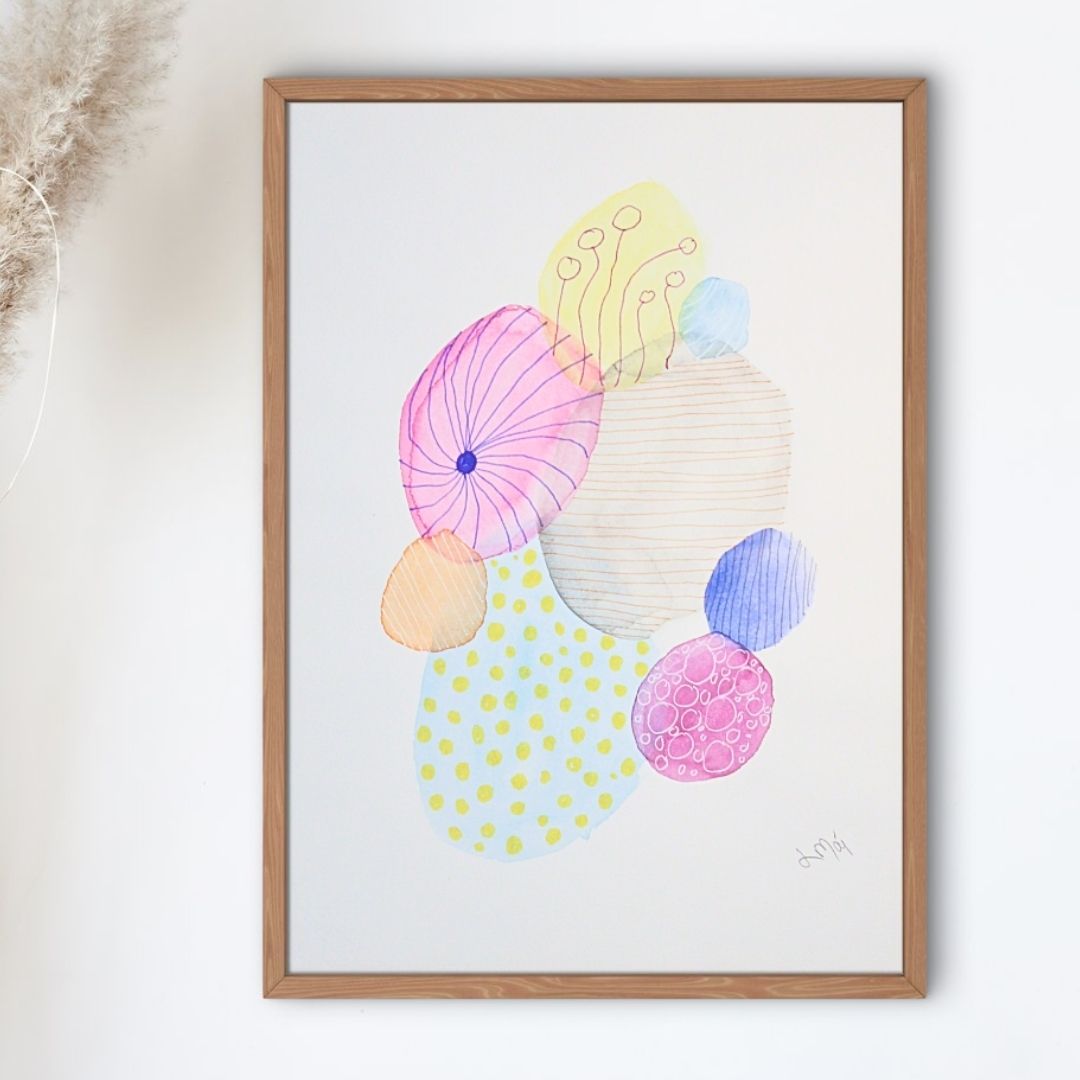 Original 30×40 cm akvarel fra gople-serien malet i bløde pastelfarver med cirkulære mønstre og legende former. Et fantasifuldt og stemningsfuldt værk, der med sit lette udtryk passer både til hjemmet, kontoret og børneværelset.