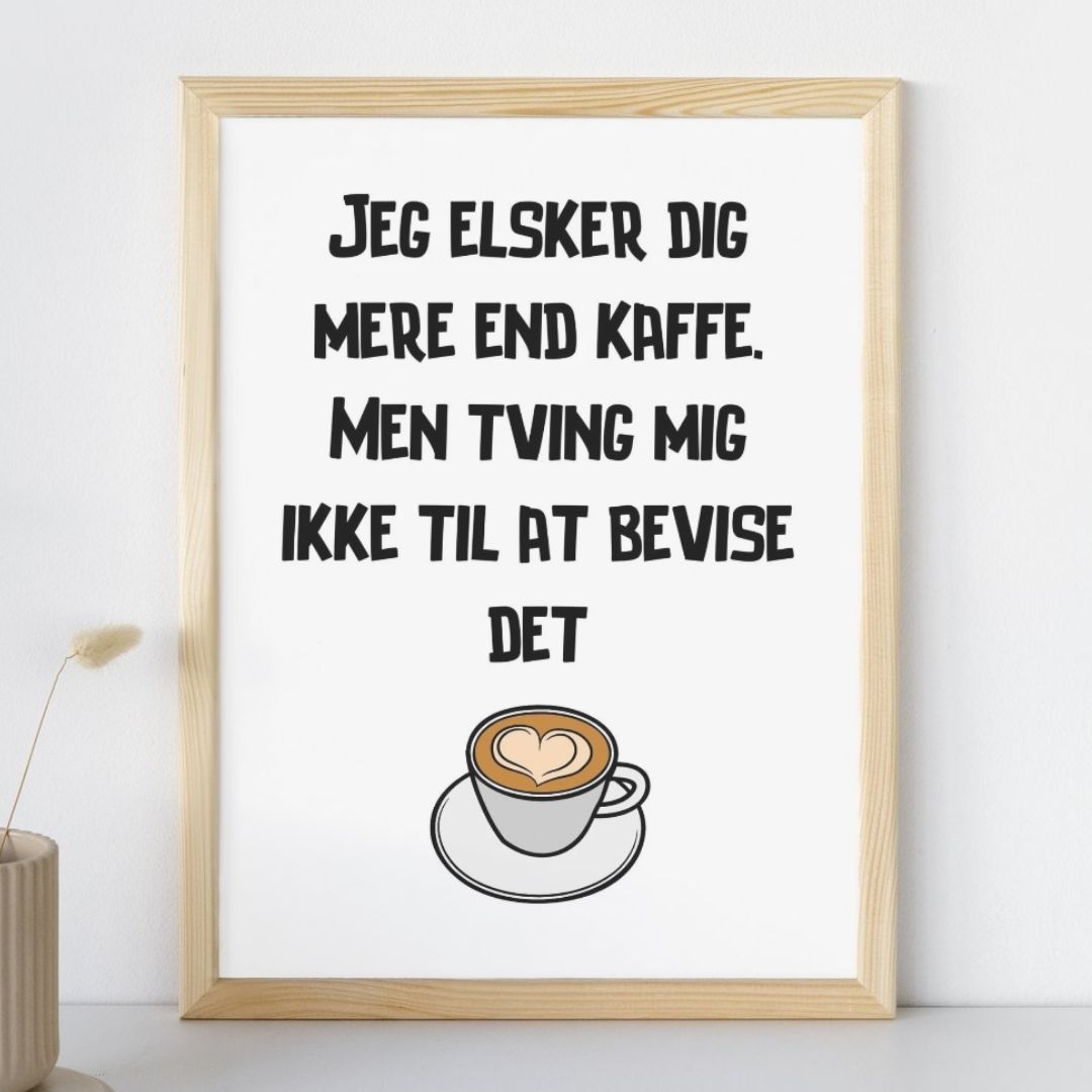Et humoristisk og varmt citatkort om kærlighed, vaner og små sandheder i hverdagen. “Jeg elsker dig mere end kaffe men tving mig ikke til at vælge” er en kærlig erklæring med glimt i øjet, der passer perfekt til hjem og rum, hvor personlighed og lethed gerne må fylde.