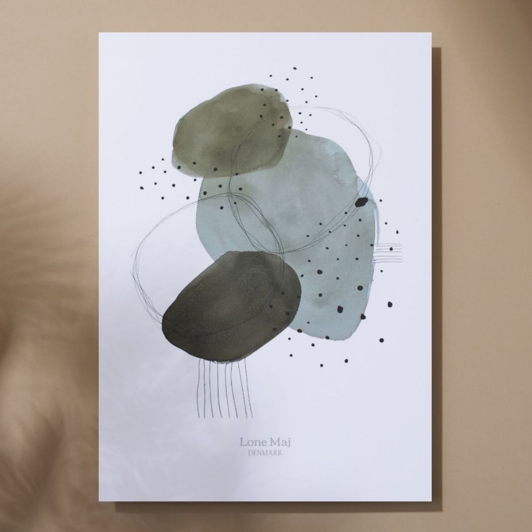 De mørkegrønne toner skaber en stemning af natur, dybde og nærvær. Farverne føles moderne, men samtidig tidløse, og plakaten kan nemt kombineres med både lyse vægge og mere farvemættede rum. Det er et værk, der skaber ro uden at forsvinde.
