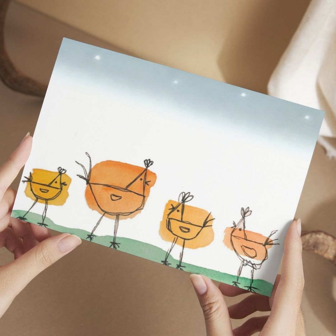 Sjovt og farverigt A6 dobbeltkort med Sjove høns, malet med akvarel og tusch og trykt på papir i høj kvalitet. Perfekt til fødselsdag, jubilæum eller som en sjov hilsen “bare fordi”. Et kort der garanteret skaber smil og gør din besked mere personlig. Dobbeltkort inkl. kuvert.