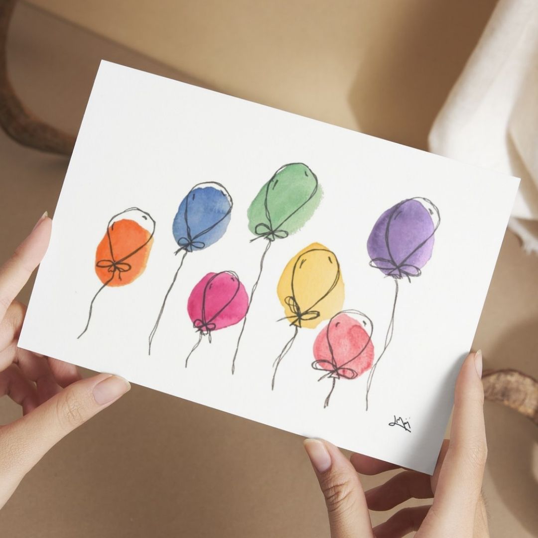 Festligt A6 kort med balloner i farverige nuancer, malet med akvarel og tusch. Perfekt til fødselsdag, jubilæum, baby shower eller som en glad hilsen “bare fordi”. Et kort der spreder smil og gør enhver gave eller fejring lidt mere gennemført. Inkl. kuvert og trykt på papir i høj kvalitet.